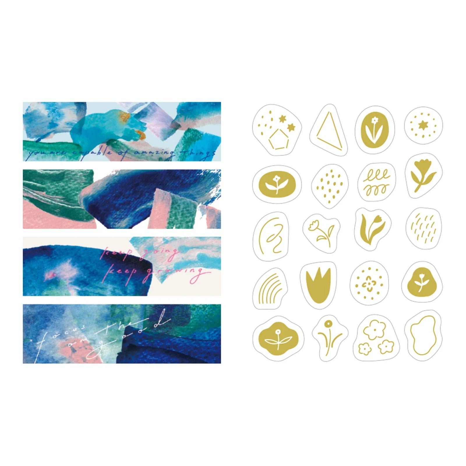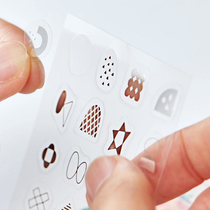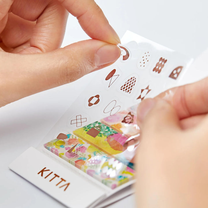 Compact and portable decorative washi tape solution for many creative uses besides adding colors to your journals! Each sheet is easily removable and reusable. One booklet has 4 patterns with 10 sheets each. This set includes masking tape and clear foil stickers that can be layered to create collages .