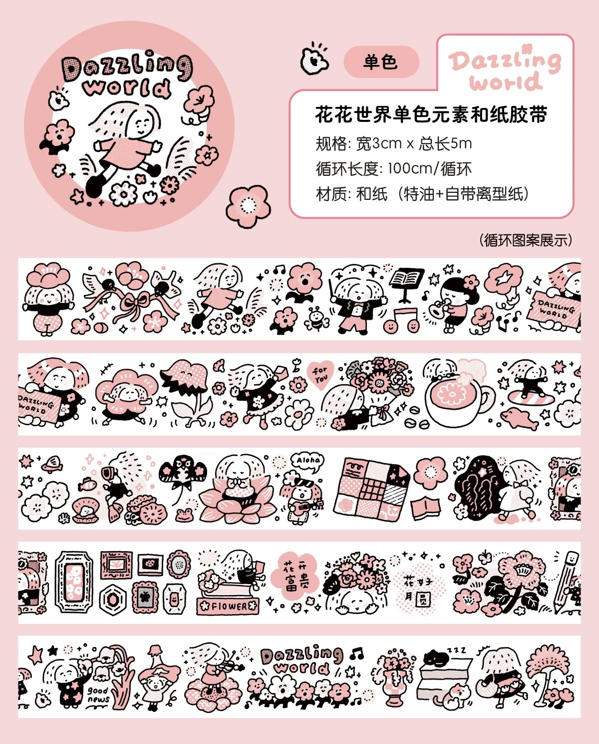 - Size: W 30mm (Tape length: 5m, repeat of 100 cm of pattern)