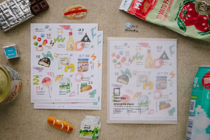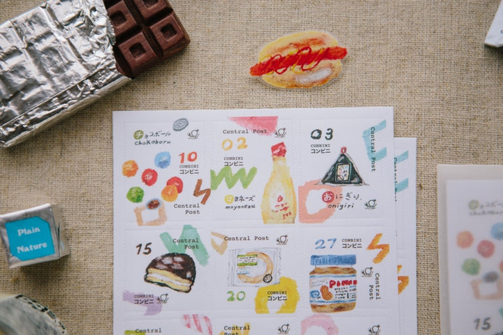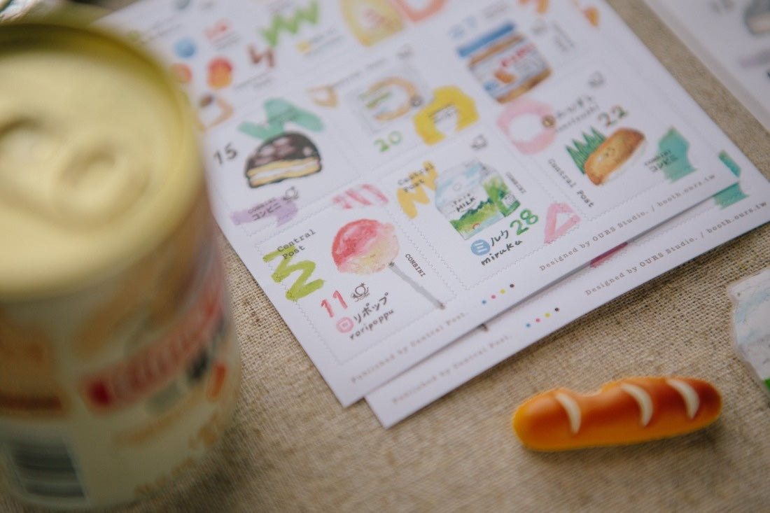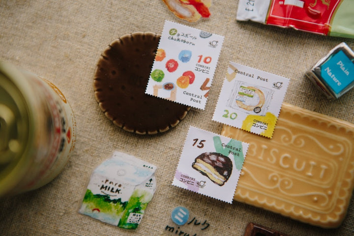 Tiny chocolate balls, mayonnaise you need at the last minute while cooking, or breakfast milk and triangular rice balls when traveling—all these memories from trips to Japan are captured with oil pastels, framed with delicate stamp borders to become convenience store stamp stickers!